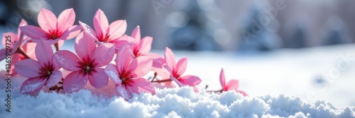 Fototapeta premium Frozen pink flowers contrast sharply with pristine white snow , pink, cherry,...