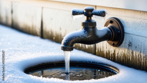 © Oscar, Obraz premium Frozen pipe leaking outside the house