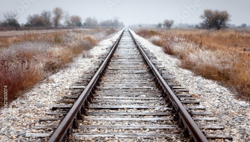 Fototapeta premium Frozen railway tracks stretching into a vast landscape.