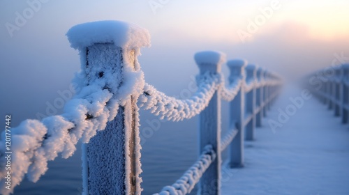 Fototapeta premium Frozen rope and railing covered with snow and ice crystals in winter wonderland