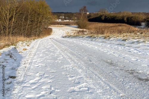 © Kassandra, Fototapeta premium Frozen rural road in winter daylight landscape.