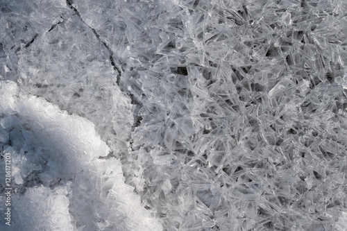 Fototapeta premium Frozen stream and ice closeup photo. Beautiful winter abstract background in...