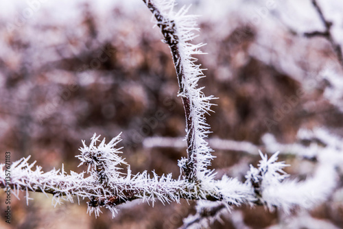 © Alex, Obraz premium Frozen tree branch covered with hoarfrost spikes in winter forest with blurred brown background.