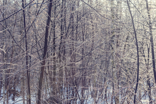 Fototapeta premium Frozen tree branches at winter morning time.