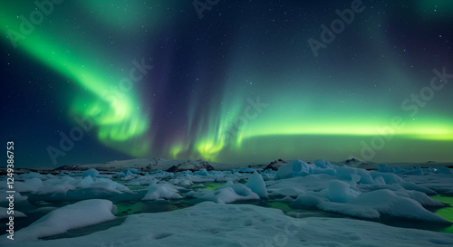 Naklejka premium Frozen Tundra with Jagged Icebergs Glowing Under an Ethereal Aurora Borealis