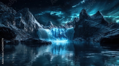 Naklejka premium Frozen waterfall at night, starry sky, mountains, calm lake; fantasy landscape