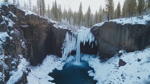 © Biancaart, Fototapeta premium Frozen Waterfall Cascading Down Columnar Basalt Cliffs