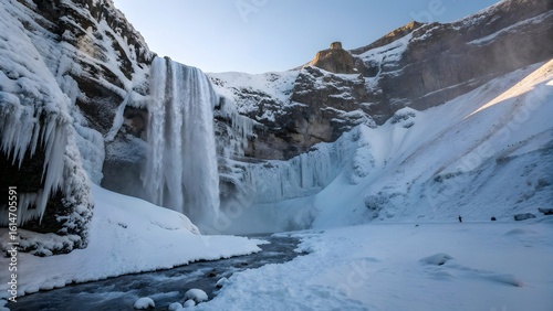 © Anu, Fototapeta premium Frozen Waterfall in Snow-Covered Canyon