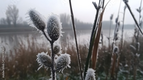 © Shehub, Fototapeta premium Frozen Winter Plant by River, Icy Frost on Seeds, Nature Photography