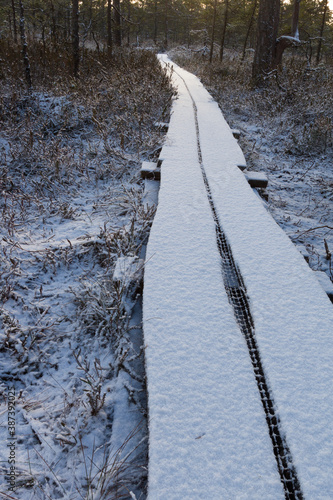 © EriksZ, Obraz premium frozen wooden walking trail in the bog lake