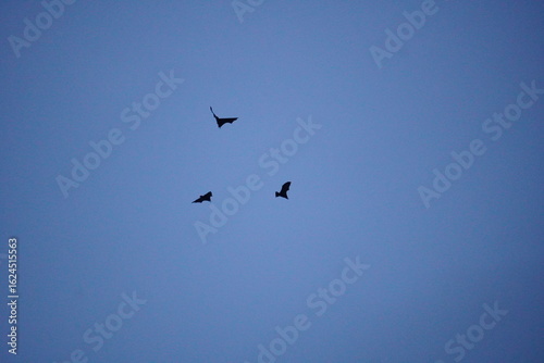 Fototapeta premium fruit bats, specifically flying foxes in flight against a blue sky.