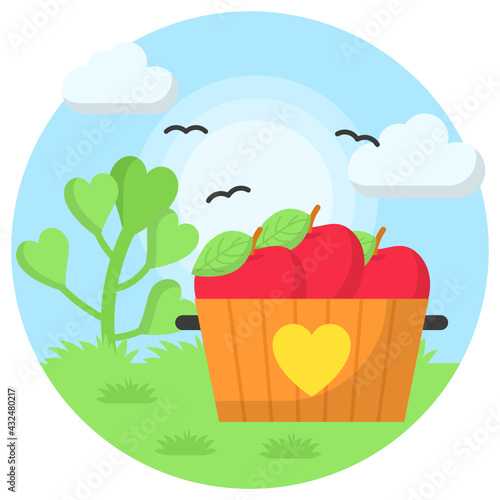 Fototapeta premium Fruit Farm Concept, Fruits in Bucket with sky and clouds Vector Color Icon Design, Nature Lover Symbol, Heart in nature Stock illustration, Beautiful Landscape scenery Ideas in Round Shape,