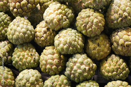 Fototapeta premium Fruit scene - fresh raw sweetsop, custard apple in market - backdrop and beautiful detail