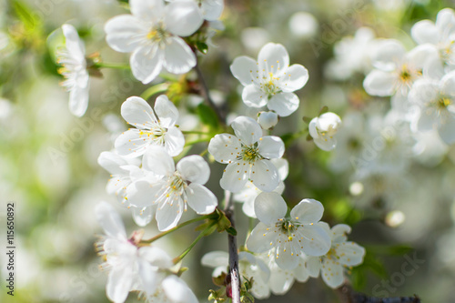 Fototapeta premium Fruit tree branch close-up. Spring bright flowers.