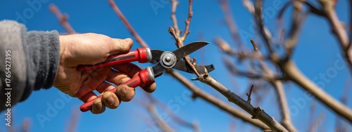 © Anna, Fototapeta premium Fruit tree pruning: gardener's hand with secateurs removing an unwanted branch