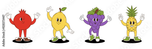 © Ekaterina Karikh, Obraz premium Fruits set in retro groovy style. Groovy retro characters of pomegranate, lemon, grapes, pineapple.