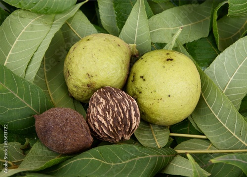 © Maria Brzostowska, Fototapeta premium fruitsand leaves of black walnut tree
