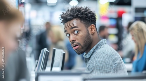 © Fidel, Fototapeta premium Frustrated tech buyer in a crowded electronics store. Featuring high prices and long lines