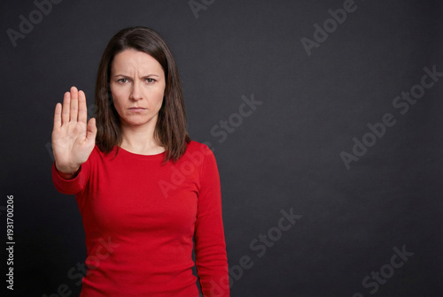 © Kudrat, Fototapeta premium Frustrated Woman Showing Stop Hand Gesture Against Dark Gray Background, Expressing Disagreement or Warning