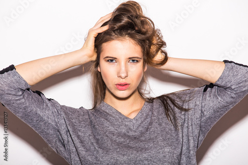 © dianagrytsku, Fototapeta premium Frustrated young woman covering ears by hands while standing against grey background