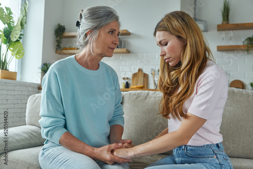 Fototapeta premium Frustrated young woman sharing problems with mother while both sitting on the...