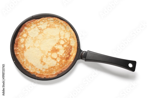 © Pixel-Shot, Fototapeta premium Frying pan with tasty thin pancake on white background