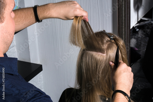 Fototapeta premium Fryzjer robi fryzurę młodej kobiecie.