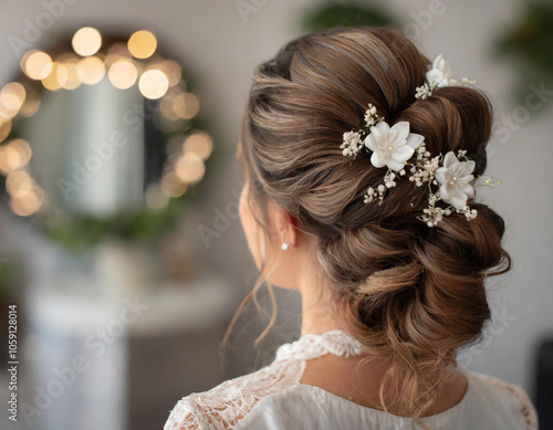 Fototapeta premium Fryzura ślubna z kwiatami upięcie ślubne