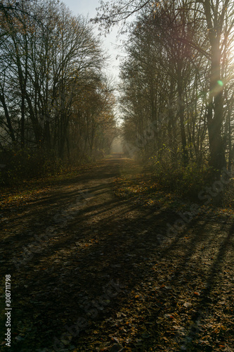 Obraz premium Fußweg im Herbst mit Laub, Licht und Schatten