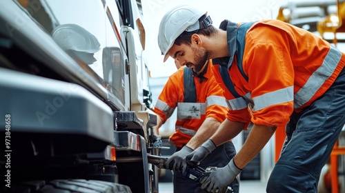 © sirisakboakaew, Fototapeta premium Fuel truck maintenance team working on vehicle safety and efficiency