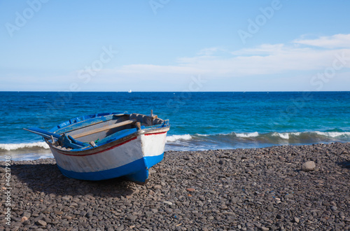 Naklejka premium Fuerteventura, old boat on black volcanic stone beach in Pozo N