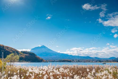 Obraz premium Fuji mountain in Japan Beautiful tourist attractions that show the culture, traditions, visitors can visit every day, Iconic and Symbolic Mountain of Japan. Landscape of Fujisan at Kawaguchiko.