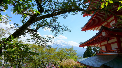 © Tatiana, Fototapeta premium Fujiyoshida / Japan - May 02 2019: Red Chureito pagoda and Mountain Fuj