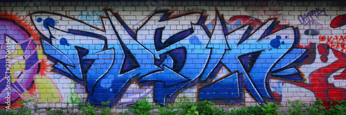 © mehaniq41, Obraz premium Full and acomplished graffiti artwork. The old wall decorated with paint stains in the style of street art culture. Colored background texture