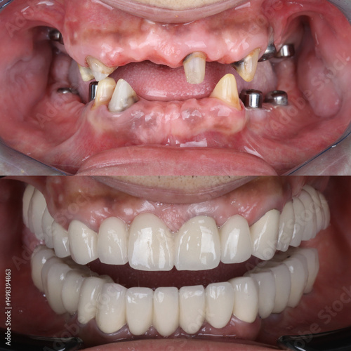 Fototapeta premium Full-arch denture prosthesis with dental implants placed in the jawbone. Full arch implant treatment with porcelain prosthesis. Dental before after and smile makeover.