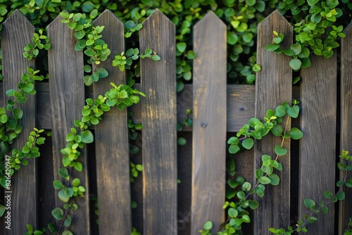 Fototapeta premium Full background texture of a wooden fence partially covered with fresh green leaves, denoting natural growth and privacy