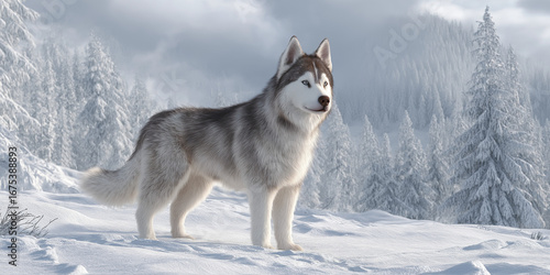 Fototapeta premium Full body 3D Siberian Husky, standing on snow, realistic fur, winter landscape