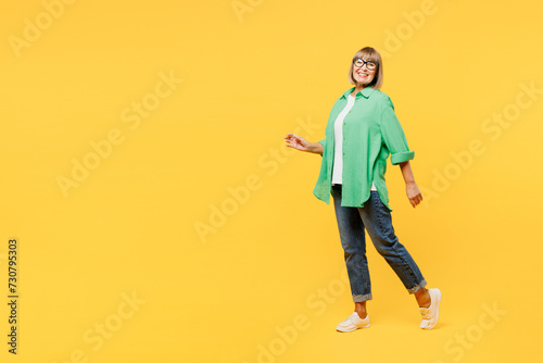 © ViDi Studio, Fototapeta premium Full body elderly side profile view blonde woman 50s years old wear green shirt glasses casual clothes walking going look camera isolated on plain yellow background studio portrait. Lifestyle concept.