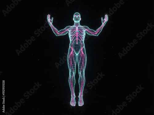 Obraz premium Full Body Glowing AI Humanoid in Data Void