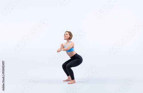 Obraz premium Full body length gaiety shot athletic and sporty woman doing healthy and meditative yoga exercise workout posture on isolated background. Healthy active and body care lifestyle