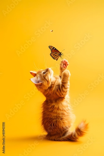 © Sangkarn, Fototapeta premium Full body of orange cat playing with a butterfly, on solid yellow screen background, fashion photography, evenly lighting