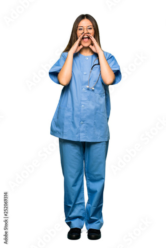 Fototapeta premium Full body of Young nurse shouting and announcing something