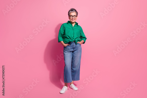 © deagreez, Fototapeta premium Full body photo of attractive pensioner woman posing hands pockets defile dressed stylish green clothes isolated on pink color background