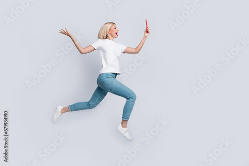 © deagreez, Fototapeta premium Full body photo of cute girl wear stylish t-shirt running staring on discount notiffication in smarthone isolated on gray color background