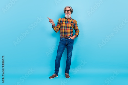 © deagreez, Fototapeta premium Full body photo of excited aged man indicate finger empty space ads promotion direct isolated over blue color background