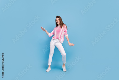 Fototapeta premium Full body photo of excited satisfied lady partying dancing spend free time isolated on blue color background