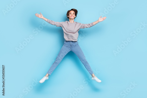 Fototapeta premium Full body photo of short hairdo young lady jump wear shirt jeans shoes isolated on blue color background