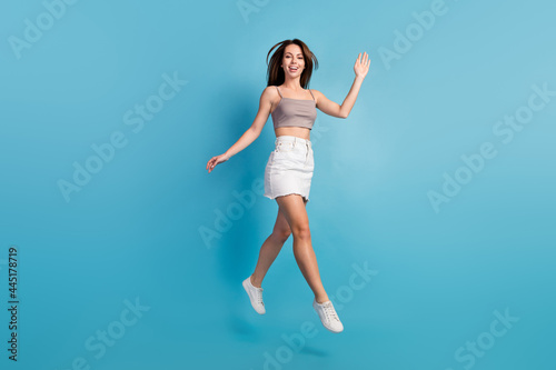 Obraz premium Full body photo of young girl happy positive smile jump up waving hand hello...