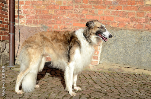 © Kim, Fototapeta premium Full body portrait of a borzo standing with a red brick wall as background.