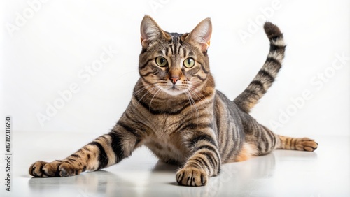 © DigitalArt Max, Naklejka premium Full-body portrait of a tabby cat stretching on a white backdrop